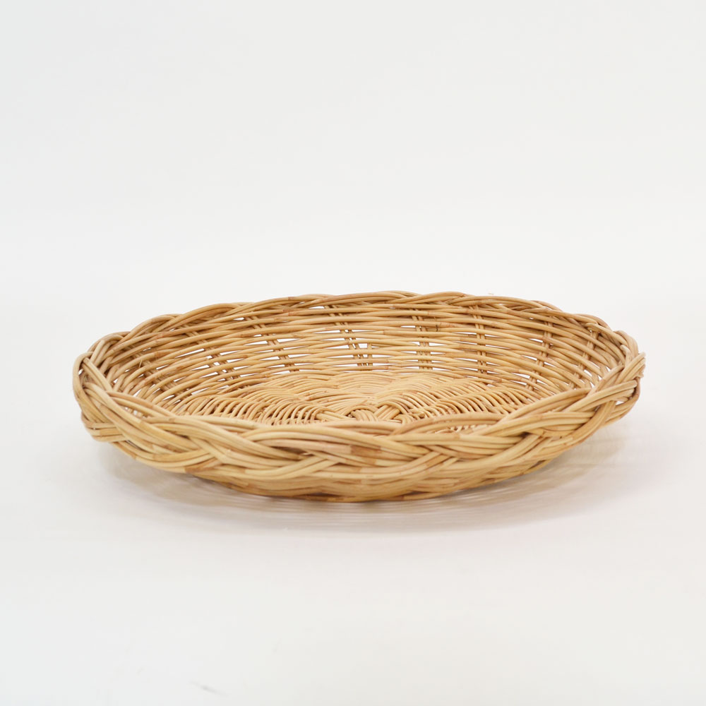 籐製のナチュラルな丸型トレイのかご。 パンやおにぎり、果物をのせてパーティなどにいかがですか?