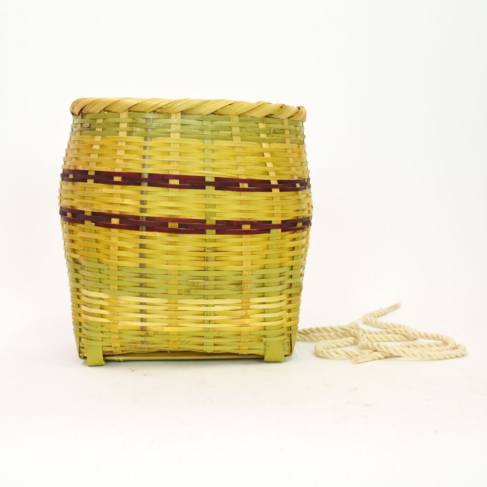 竹の収穫かご 青竹 腰籠 横縞 茶 S 山菜採り 農具 竹籠