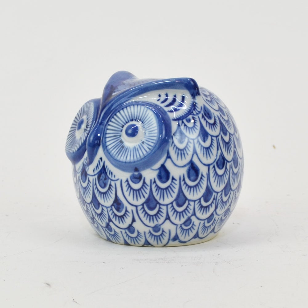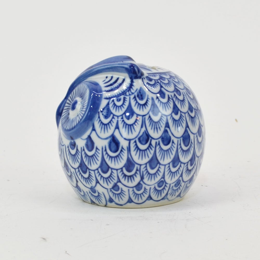 青花 丸目 梟 貯金箱 焼き物 ふくろう こども 置物 夜目