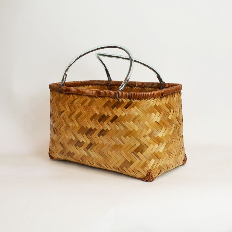 竹を細かく丁寧に編み上げた手づくりバスケット、網代編み市場籠です。