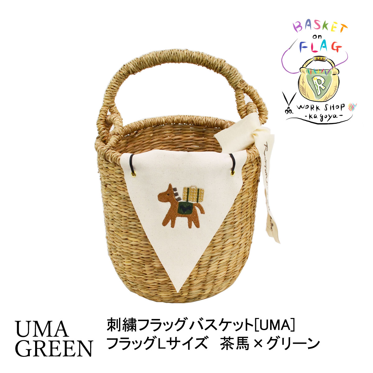 刺繍フラッグバスケットUMA ブラウンホース×緑 かごバッグ