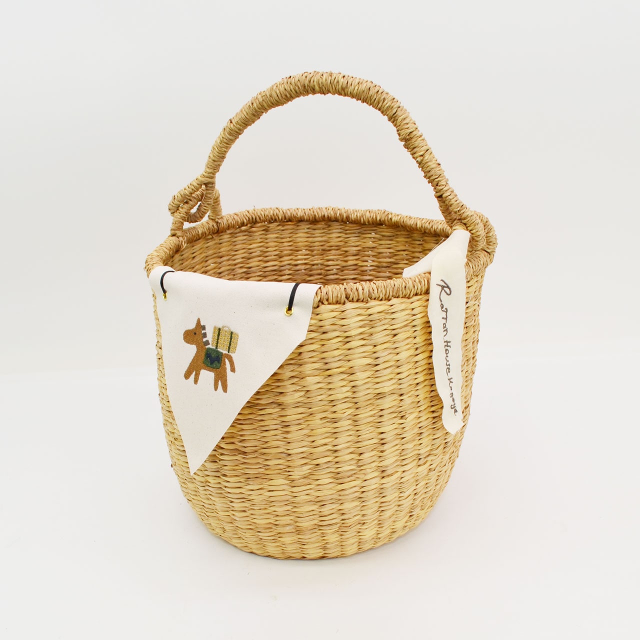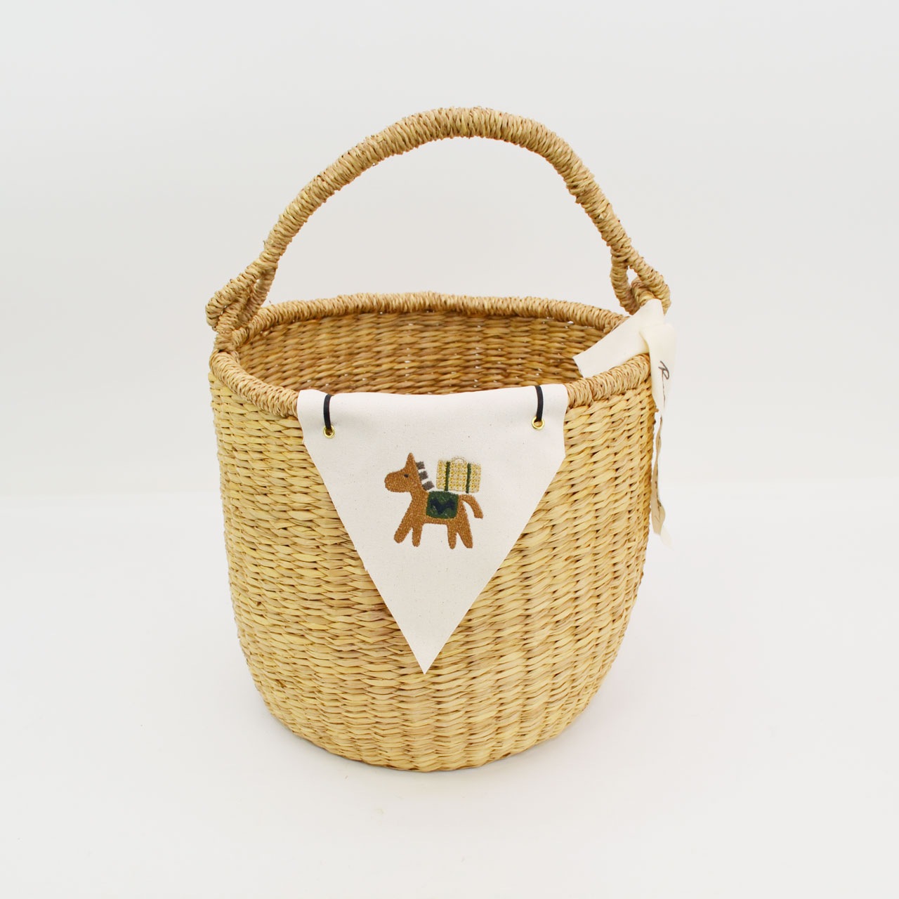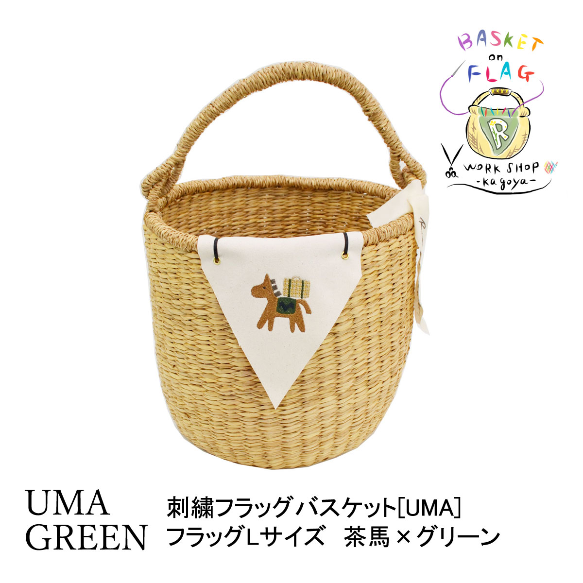 刺繍フラッグバスケット L ブラウンホース×緑 かごバッグ
