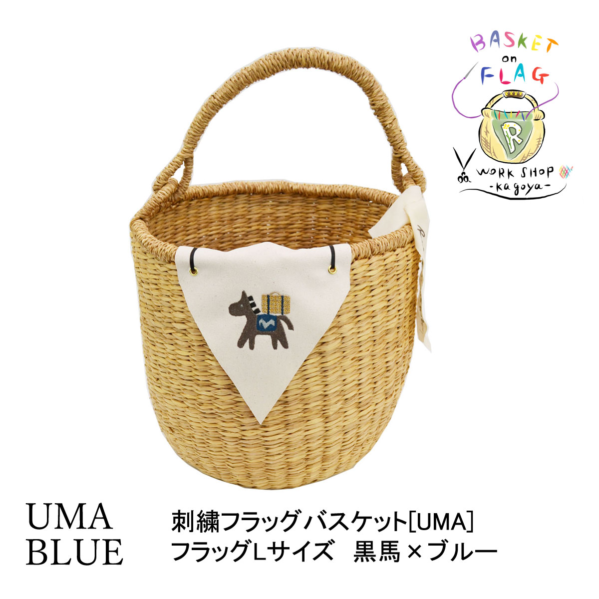 刺繍フラッグバスケット L ブラックホース×青 かごバッグ